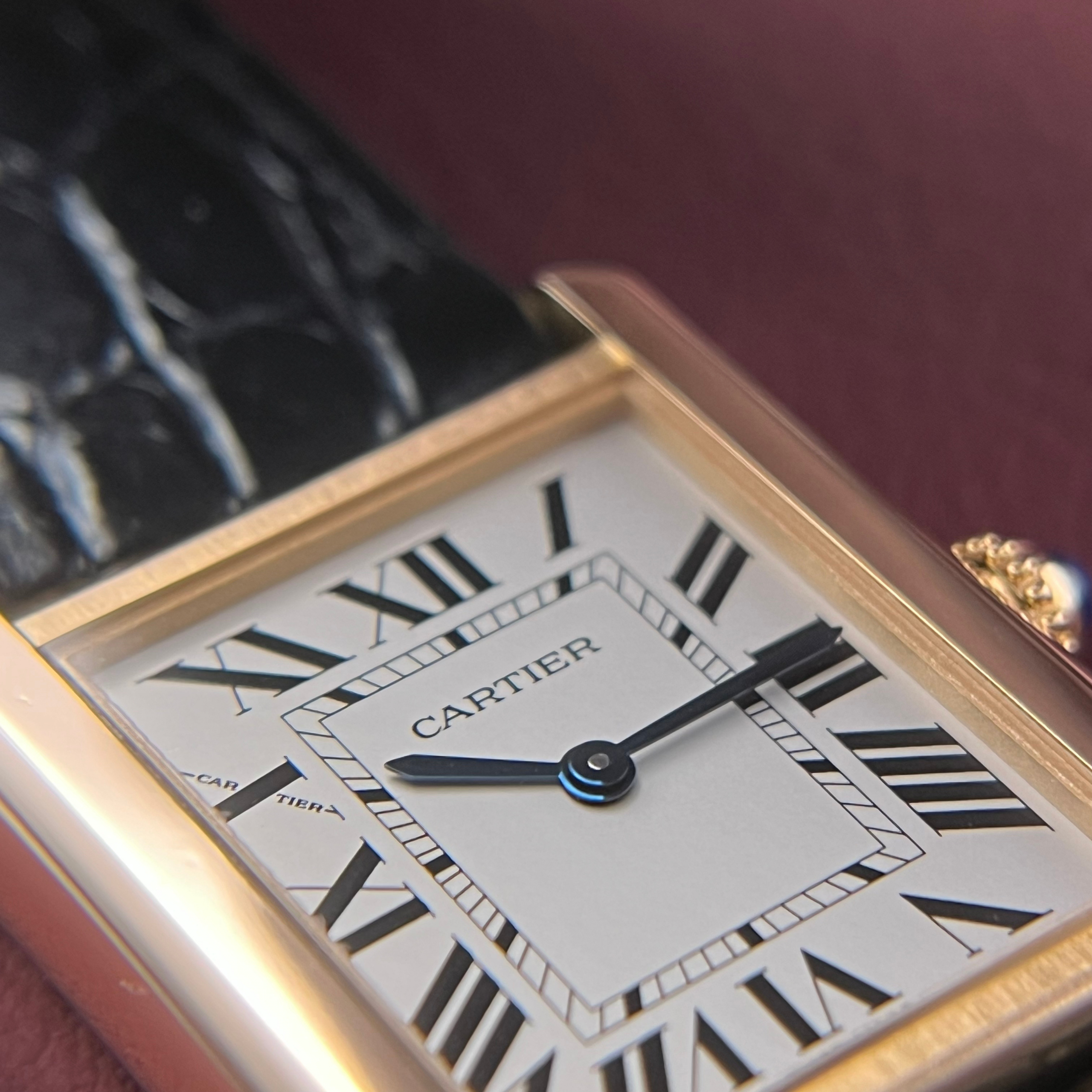 Angeboten wird eine elegante Cartier Tank Solo, Referenz W5200024 (offizielle Bezeichnung CRW5200024). Diese Ausführung besteht aus 18 K Gelbgold und zeigt das ikonische Cartier-Design: rechteckiges Gehäuse, silberfarbenes Zifferblatt mit römischen Indizes und gebläute Zeiger. Im Inneren arbeitet ein präzises Quarzwerk, das zuverlässig und wartungsarm läuft.