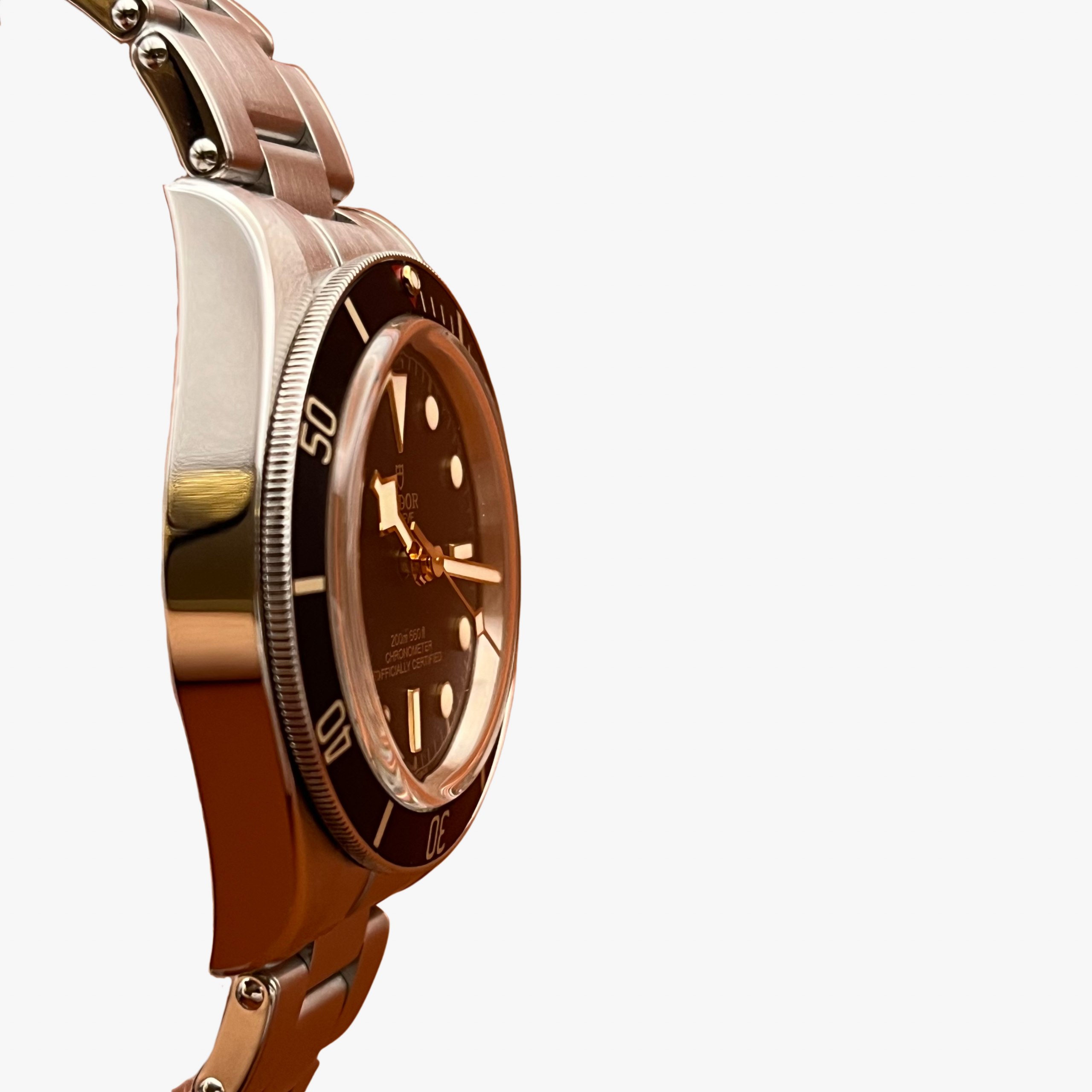 Angeboten wird eine Tudor Black Bay Fifty-Eight, Referenz 79030N, am Edelstahlband. Mit ihrem 39-mm-Gehäuse, der klassischen schwarzen Aluminiumlünette und den goldfarbenen Akzenten ist dieses Modell eine Hommage an die frühen Tudor-Taucheruhren.