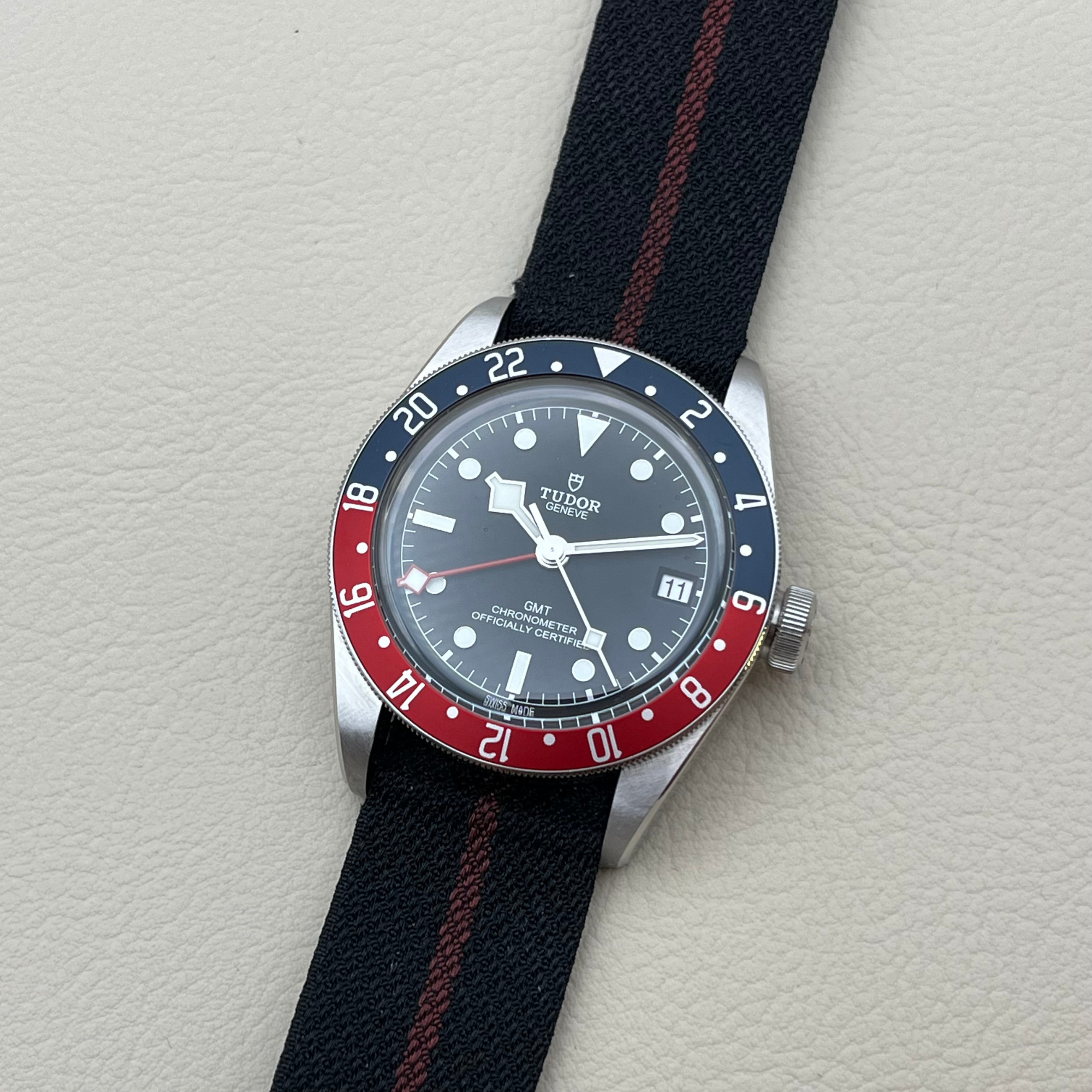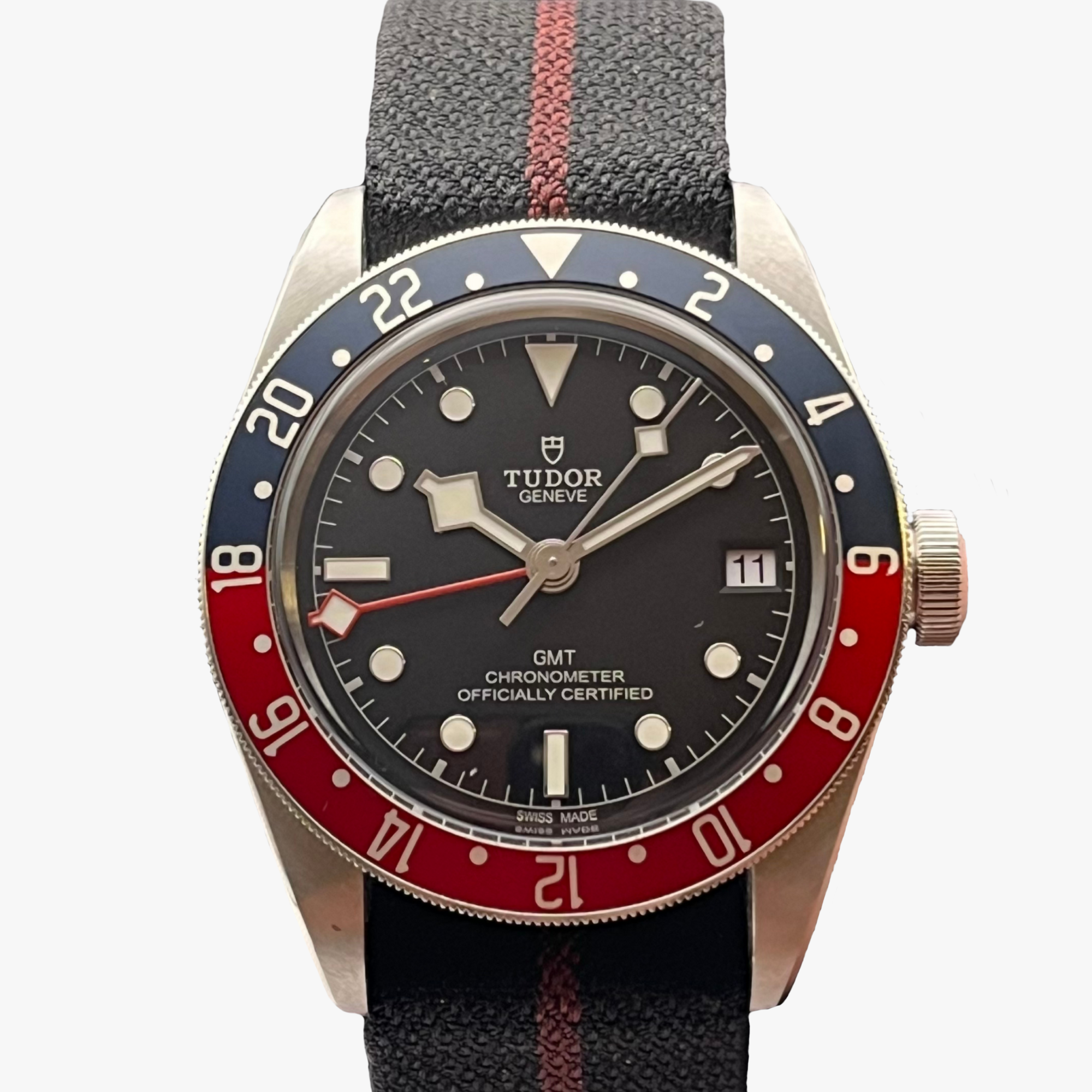 The Tudor Black Bay GMT 79830RB combines heritage-inspired aesthetics with modern functionality — perfect for globetrotters and vintage lovers alike. With its 41 mm stainless steel case, iconic red-and-blue “Pepsi” bezel, and domed matte black dial, this timepiece stands out through subtle details and unmistakable character.